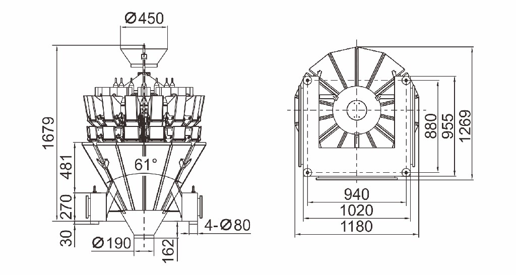 5. Boîtier de machine étanche IP65, pièce de contact matériel avec plaque à fossette, goulotte de décharge à 60 ° laissant le matériau tomber en douceur.