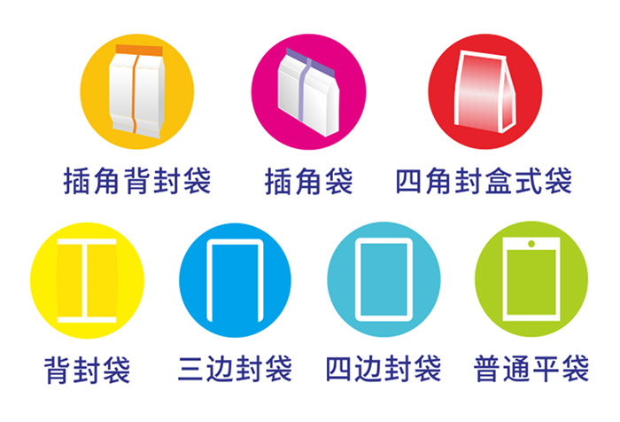 背封袋(枕式袋)、插角袋、印边袋、挂孔袋、四边封、三边封。